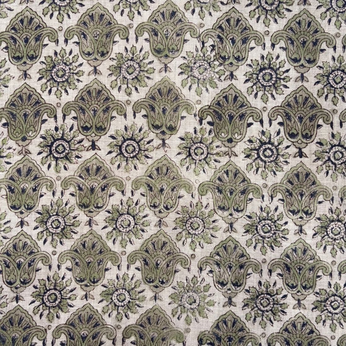The Bhini Block Printed Linen Fabric is a handblock printed linen from Jaipur, India, created using a traditional Indian hand block printing process practiced by master artisans and passed down through generations. Each motif is applied by hand with carved wooden blocks, resulting in natural variations that reflect the authenticity of handmade linen fabric and skilled craftsmanship.