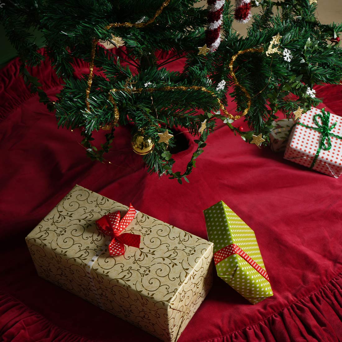 It covers the base of the Christmas tree, hides stands, catches fallen needles, and enhances the festive look of your holiday décor.