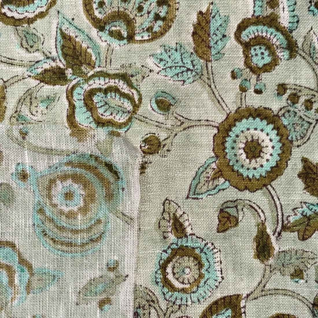 The Isara Block Printed Linen Fabric is a handblock printed linen from Jaipur, India, created using a traditional Indian hand block printing process practiced by master artisans and passed down through generations. Each motif is applied by hand with carved wooden blocks, resulting in natural variations that reflect the authenticity of handmade linen fabric and skilled craftsmanship.