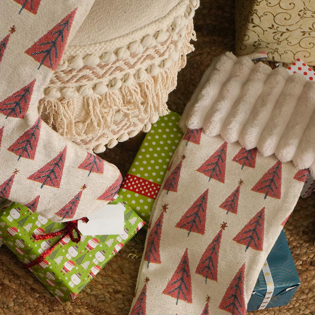 Yes — the neutral base and red motifs complement both modern and traditional Christmas décor.